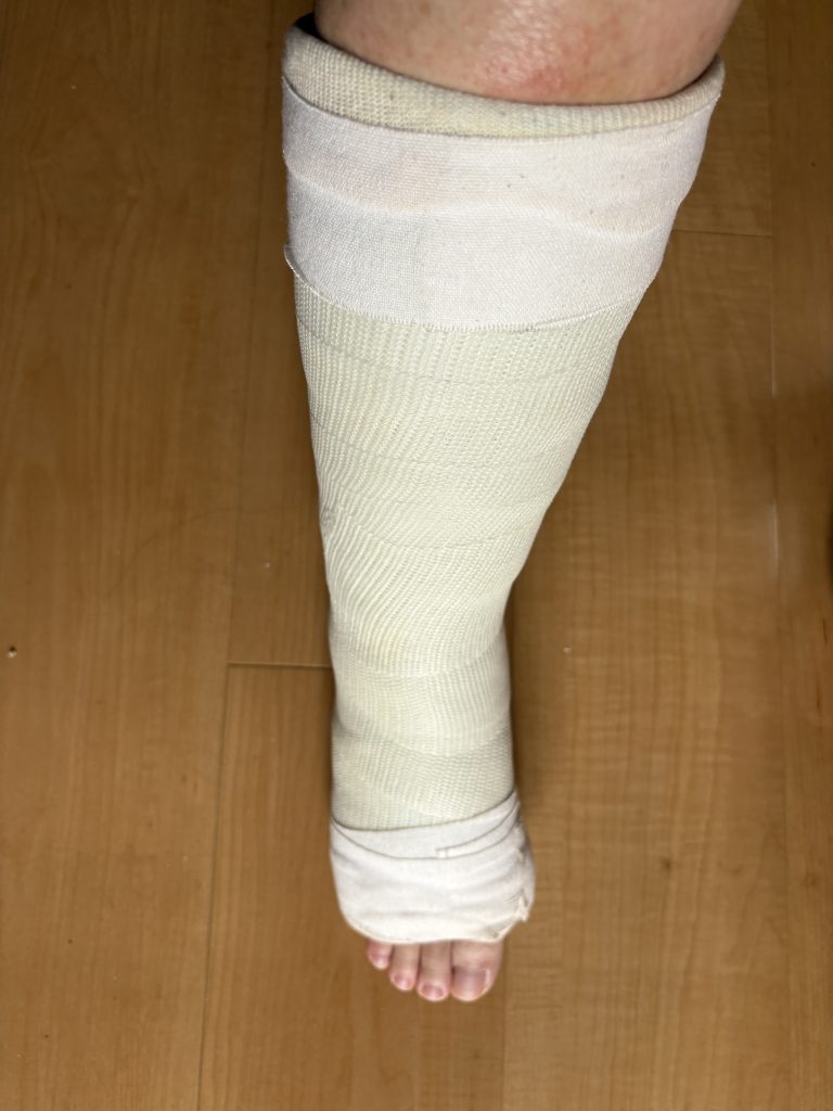 3週経過後ギプス交換の際ギプスにヒールが付けられたが、足首を伸ばして固定されていた上ギプスで指先が曲がらず歩行は無理だった。