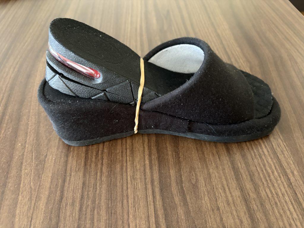 装具のお陰で歩けているとは言え、左右の足の高低差が大き過ぎたので、健側は上の画像のようにハイヒールサンダルに左のシークレットインソールを付けたら、多少とも歩きやすくなった。